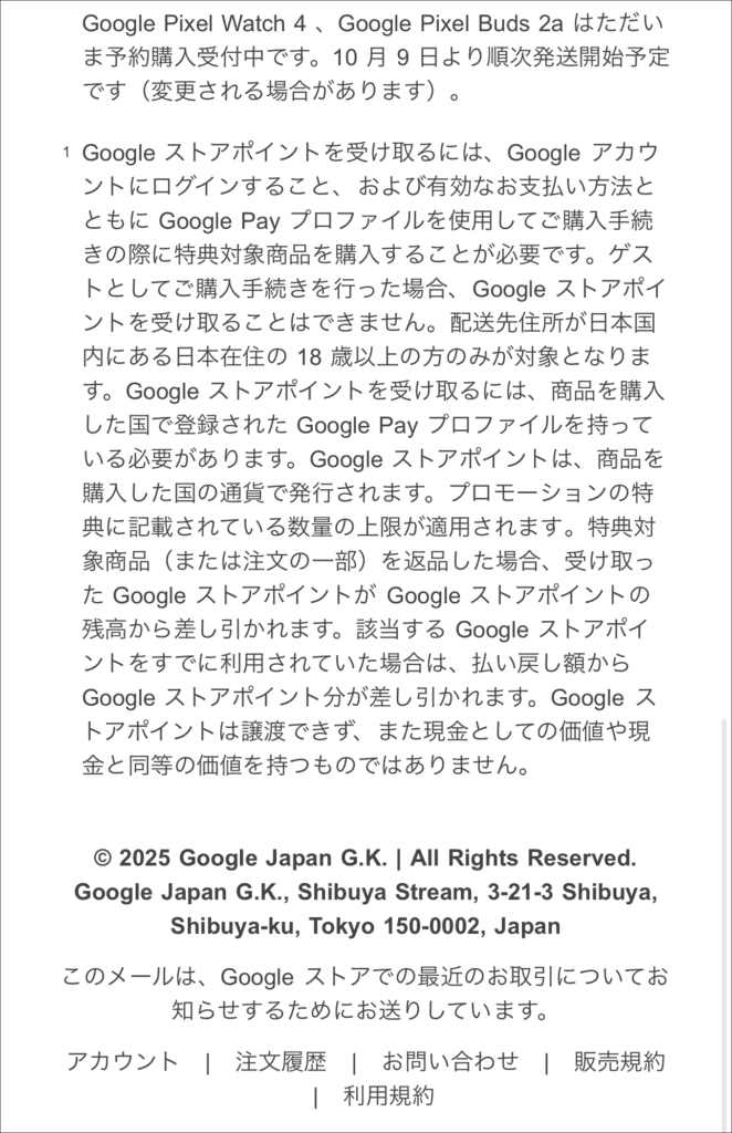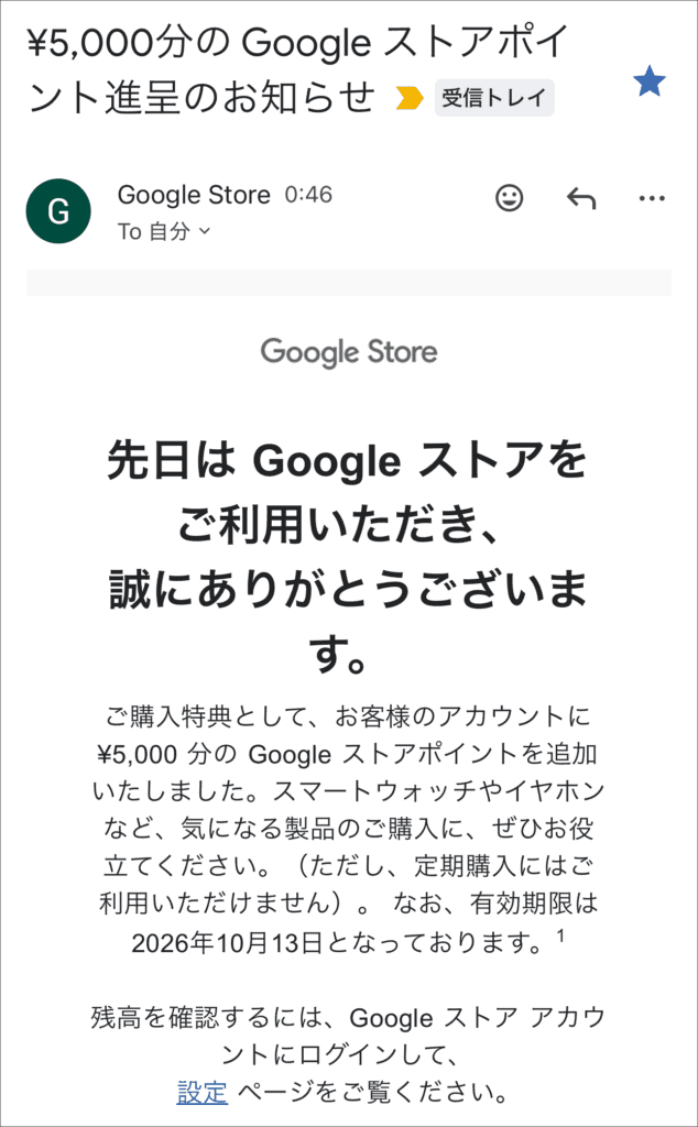 ご購入特典として、お客様のアカウントに ¥5,000 分の Google ストアポイントを追加いたしました。スマートウォッチやイヤホンなど、気になる製品のご購入に、ぜひお役立てください。(ただし、定期購入にはご利用いただけません)。 なお、有効期限は 2026年10月13日となっております。1