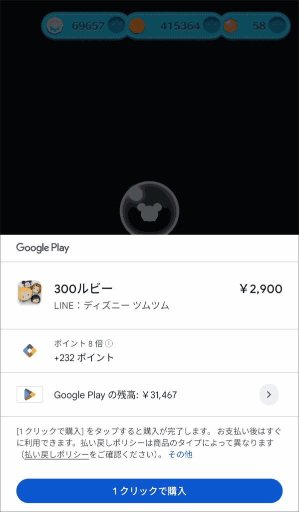 LINE:ディズニーツムツムのルビー購入にGoogle Play ポイントが使用可能になった告知画面