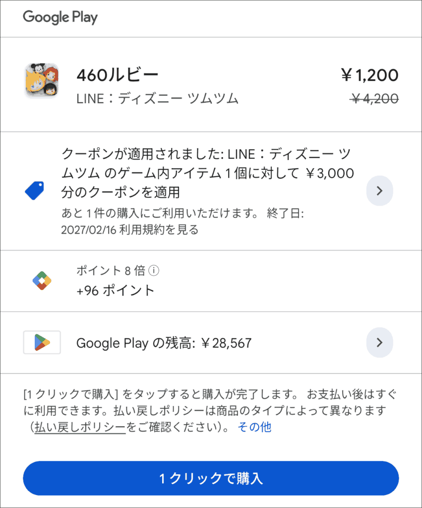 しかもGoogle ストアの購入には、1%~最大10%のGoogle Play ポイントが付与されるためさらにお得です。