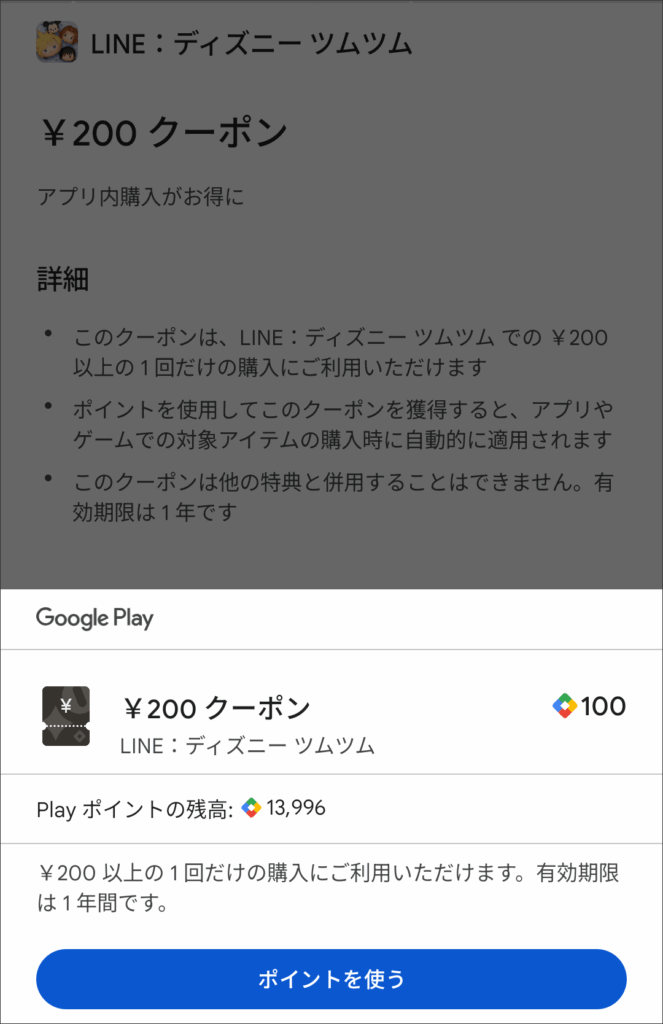 Google Play ポイントをゲームの課金に使うと半額で使うことができます。ツムツムのクーポンがついに登場しました。
