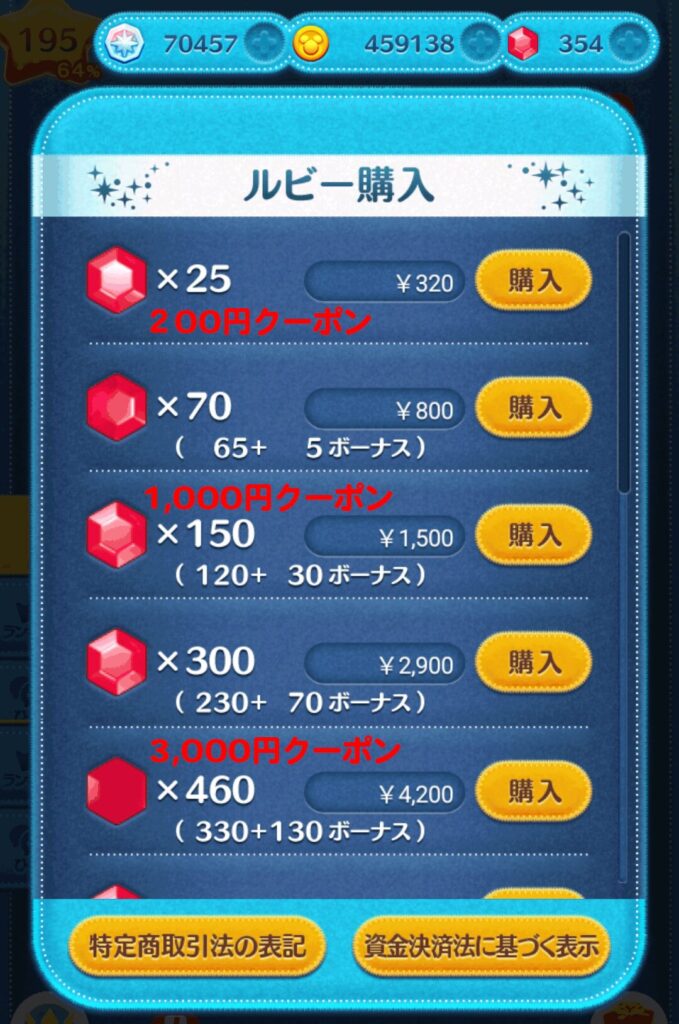 200円のクーポンを購入し300円のルビーを買えば、すぐに再度200円のクーポンを買えることをこと確認しました。