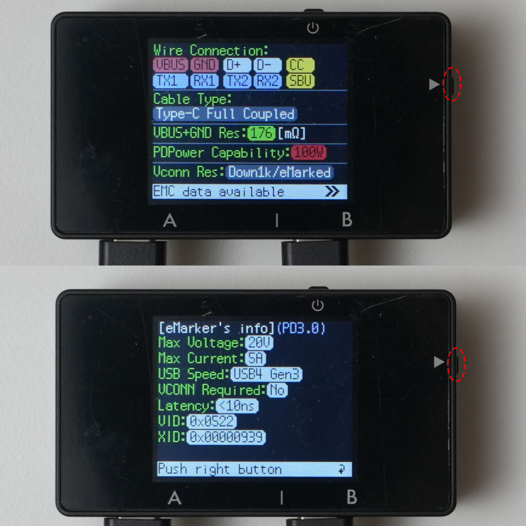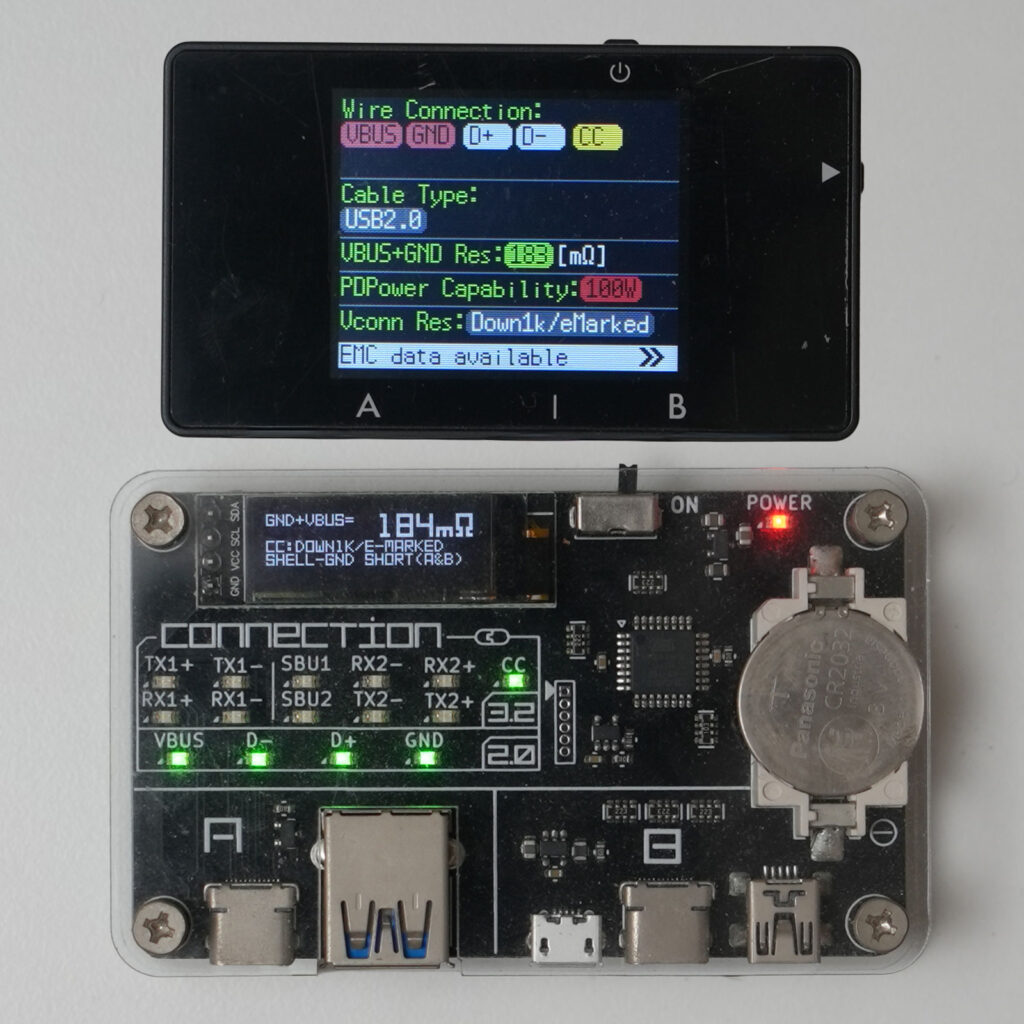 - Type-CケーブルのeMarker情報を表示し、PD対応や対応転送速度(最大80Gbps等)がすぐ分かります。