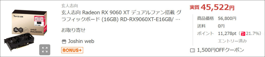 RX 9060 XTも1,500円引きクーポンを使う前でこの実質価格。とてもとてもお安いです。
