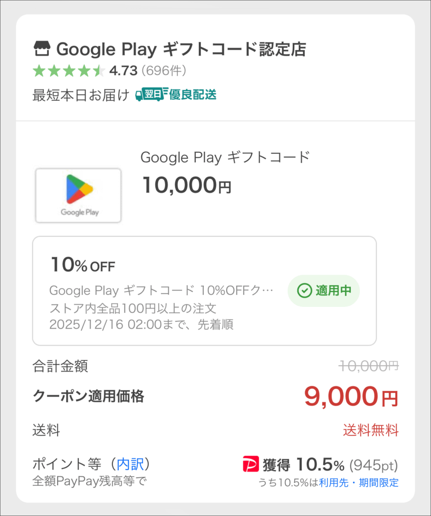 楽天に続きYahoo!ショッピングでもGoogle Play ギフトコード 10%OFFクーポンが可能です。お一人様2回限り、先着20,000回限定です。100 円以上で利用できる点が楽天より優れています。