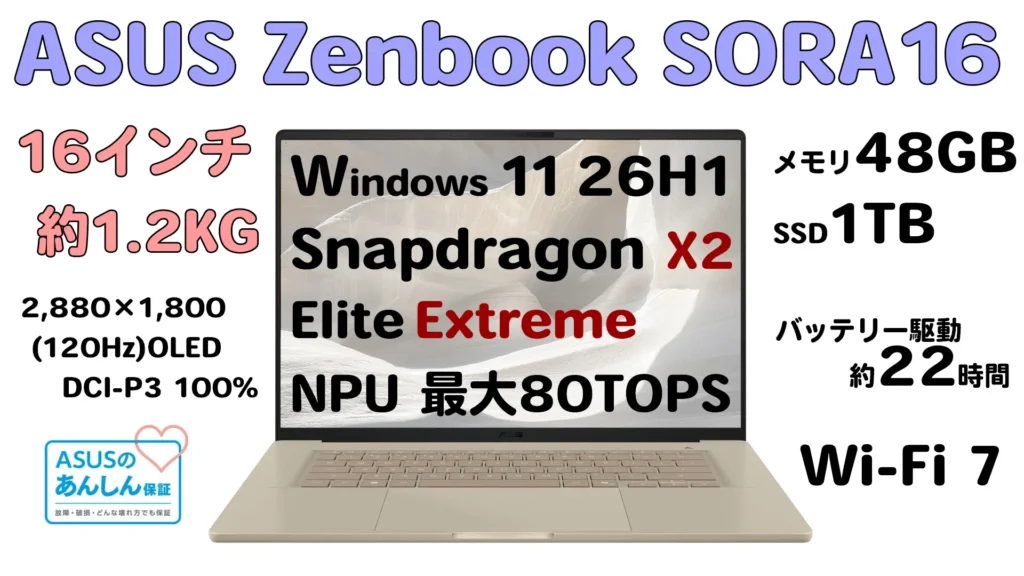 ASUS Zenbook SORA 16 (UX3607OA)が、2026年4月8日に発売されました。個人的に嬉しいのはWindows 11 26H1が日本で一番早く体験(2026年4月8日時点PCまなぶ調べ)できる点です。さすがASUSです。